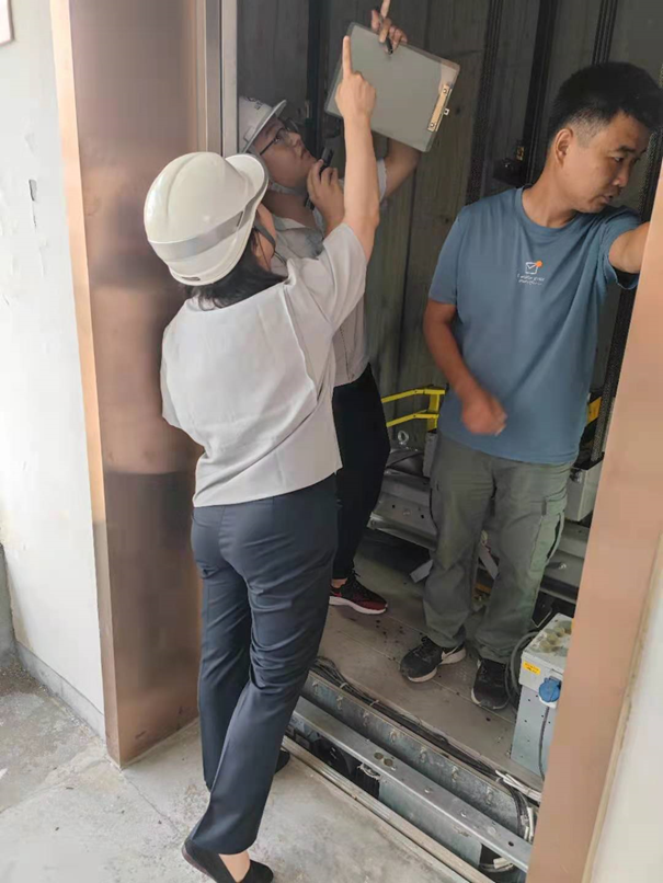為了保證工作扎實(shí)開展,鼓勵(lì)一線員工,7月30日,院公司王楠楠副總經(jīng)理到達(dá)現(xiàn)場帶班檢驗(yàn)。從資料審查開始,檢照明、試通話、進(jìn)機(jī)房、查井道、看底坑,帶班參與了全過程檢驗(yàn)。檢驗(yàn)過程中,王總還仔細(xì)了解了有關(guān)檢驗(yàn)程序和技術(shù)要求,親自查看了曳引機(jī)、限速器等運(yùn)行和動作情況,參與了鋼絲繩、轎頂、底坑、轎底等部位的檢驗(yàn)。