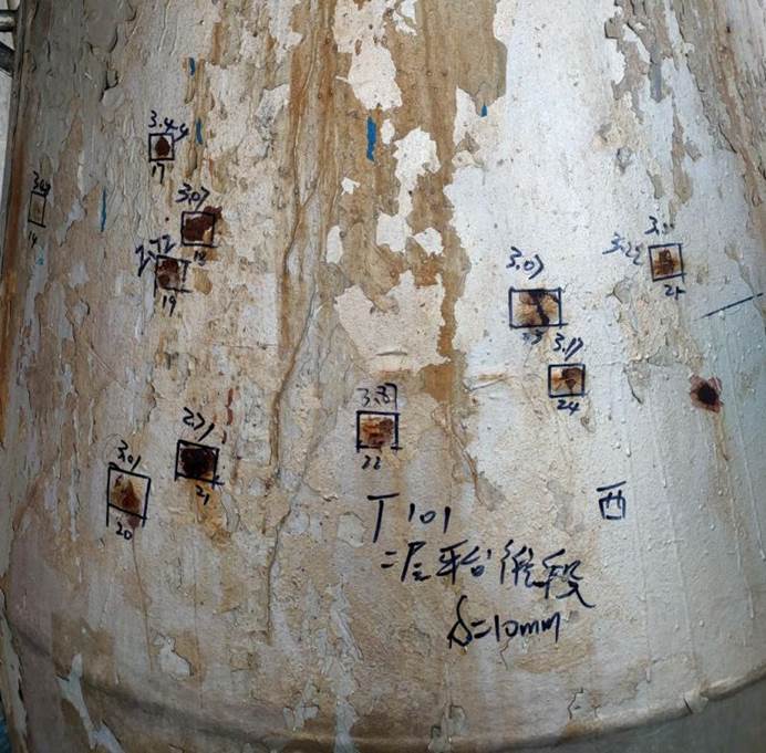 為保證企業(yè)順利開車,工程技術(shù)中心抽調(diào)精干力量,組織協(xié)調(diào)無損檢測、打磨輔助、腳手架搭設(shè)等多家單位,成立了40余人的項目組,并在停車前完成全部入廠手續(xù)的辦理?,F(xiàn)場檢驗時,項目組人員嚴格按照院公司管理體系、作業(yè)指導標準開展檢驗檢測工作,累計發(fā)現(xiàn)現(xiàn)場標識錯誤、銘牌缺失、地腳螺栓缺失、腐蝕減薄、焊接接頭開裂、氫鼓包等各類問題40余項。