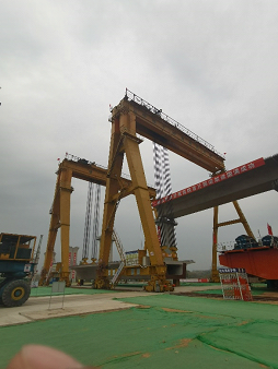兩臺450t通用門式起重機將800t箱梁起吊至運梁車