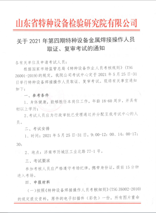 關(guān)于2021年第四期特種設備金屬焊接操作人員復審考試的通知