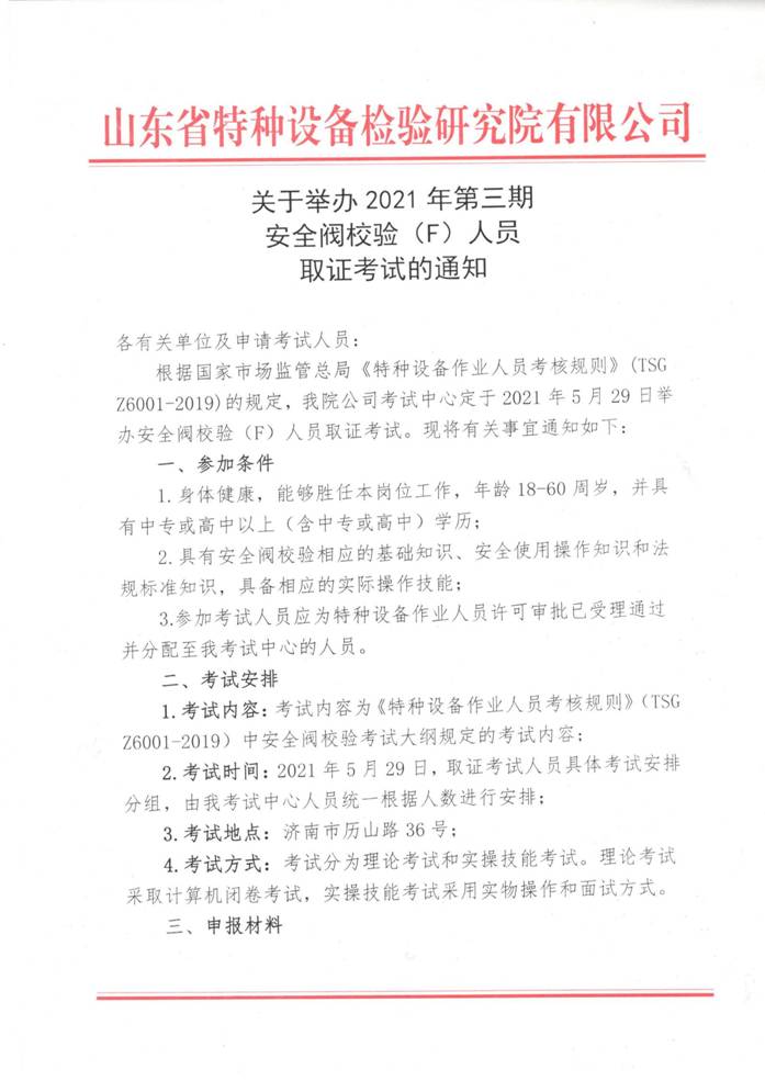 關(guān)于舉辦2021年第三期安全閥校驗(yàn)(F)取證考試的通知