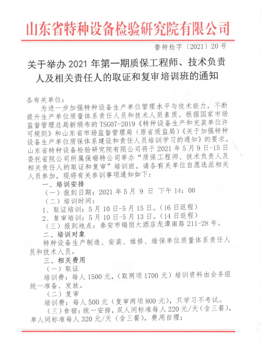 2021年第一期質(zhì)保工程師、技術(shù)負(fù)責(zé)人及相關(guān)責(zé)任人培訓(xùn)通知