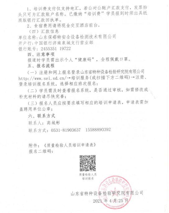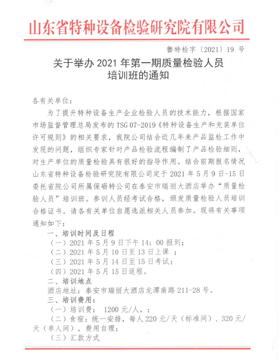 2021年第一期質(zhì)量檢驗人員培訓(xùn)通知